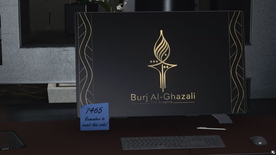 Nếu bạn đi lên lầu vào phòng khách, có lẽ chỉ sau khi hoàn thành câu chuyện về Bird of Prey Mission và giết Carl Ingram, bạn có thể vào phòng ngủ của khách từ Penthouse Terrace – tầng trên cùng của toàn bộ tòa nhà. Ở đây, có một két sắt với khóa bàn phím trên nó. Rất may, linh hồn rất thông minh đã khóa an toàn để lại một ghi chú sau đó trên màn hình trong cùng một phòng, trên bàn làm việc. Nó nói ‘7465, hãy nhớ đặt lại mã này!”, Nhưng rõ ràng họ đã có một 7465. Bạn sẽ tìm thấy một số thông tin trên các đối tác và mục tiêu tiếp theo của bạn. Có vẻ như ai đó rời khỏi căn phòng này một cách vội vàng.